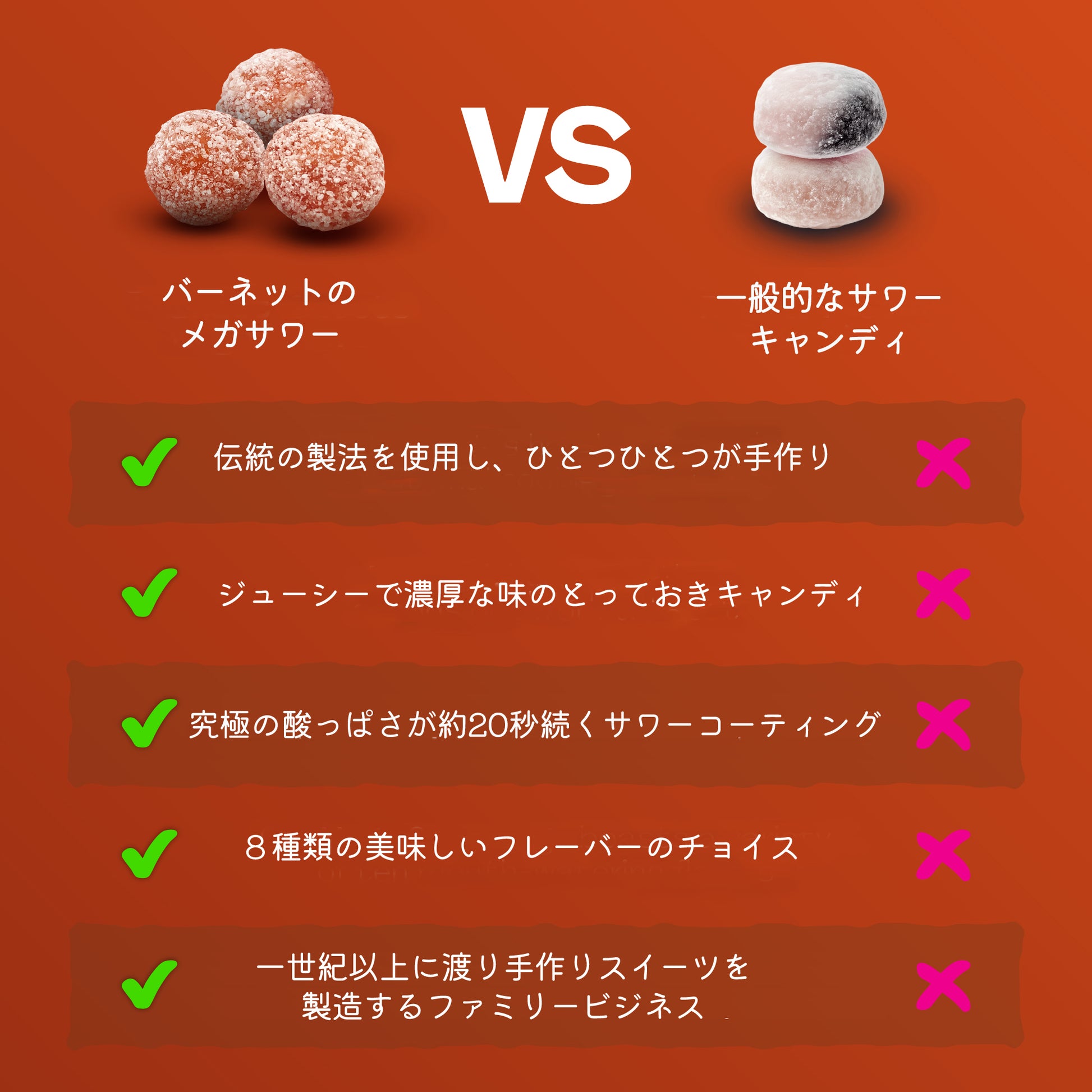 世界的に有名なBarnett Sweetsのサワースイーツはジューシーなフレーバーが中に入っています。チャレンジ精神旺盛なあなたにうってつけのキャンディです。バーネットのメガサワーは子供にも大人にも大人気。この発泡性のボイルドキャンディは、美味しくジューシーなキャンディを、非常に酸っぱいコーティングで仕上げています。